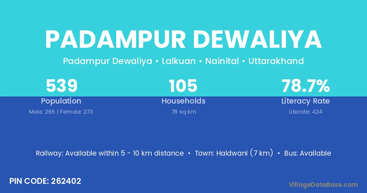 Haldwani (7 km) is the nearest town to Padampur Dewaliya village for major economic activities and is located approximately 7 km away.