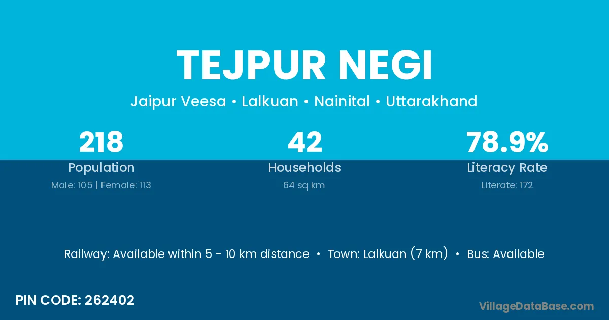 Lalkuan (7 km) is the nearest town to Tejpur Negi village for major economic activities and is located approximately 7 km away.