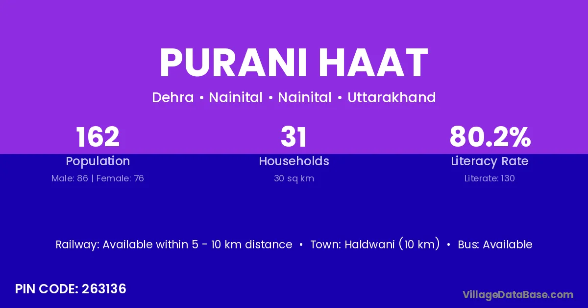 Haldwani (10 km) is the nearest town to Purani Haat village for major economic activities and is located approximately 10 km away.
