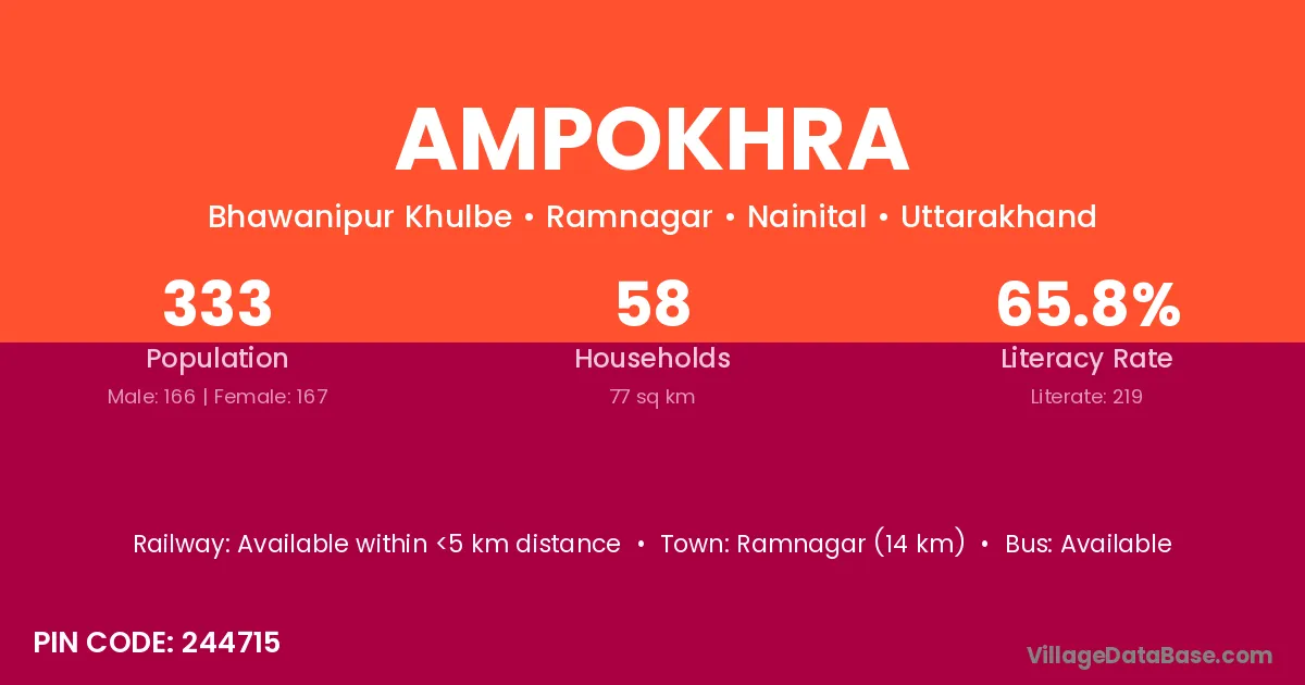 Ramnagar (14 km) is the nearest town to Ampokhra village for major economic activities and is located approximately 14 km away.