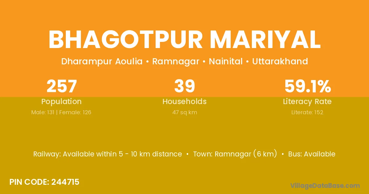 Bhagotpur Mariyal village has a total population of 257 people, of which 131 are males and 126 are females.