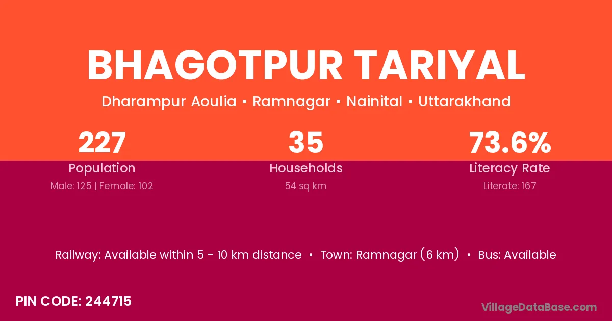 Bhagotpur Tariyal village has a total population of 227 people, of which 125 are males and 102 are females.