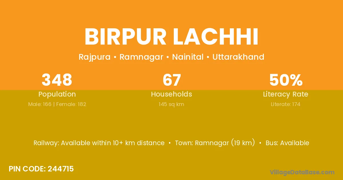 Ramnagar (19 km) is the nearest town to Birpur Lachhi village for major economic activities and is located approximately 19 km away.