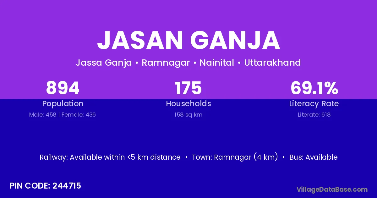 Ramnagar (4 km) is the nearest town to Jasan Ganja village for major economic activities and is located approximately 4 km away.
