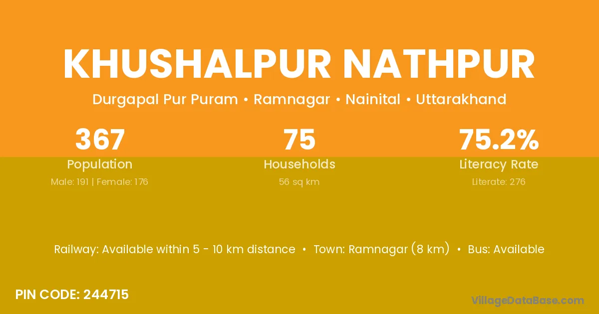 Ramnagar (8 km) is the nearest town to Khushalpur Nathpur village for major economic activities and is located approximately 8 km away.