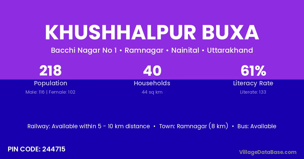 Ramnagar (8 km) is the nearest town to Khushhalpur Buxa village for major economic activities and is located approximately 8 km away.