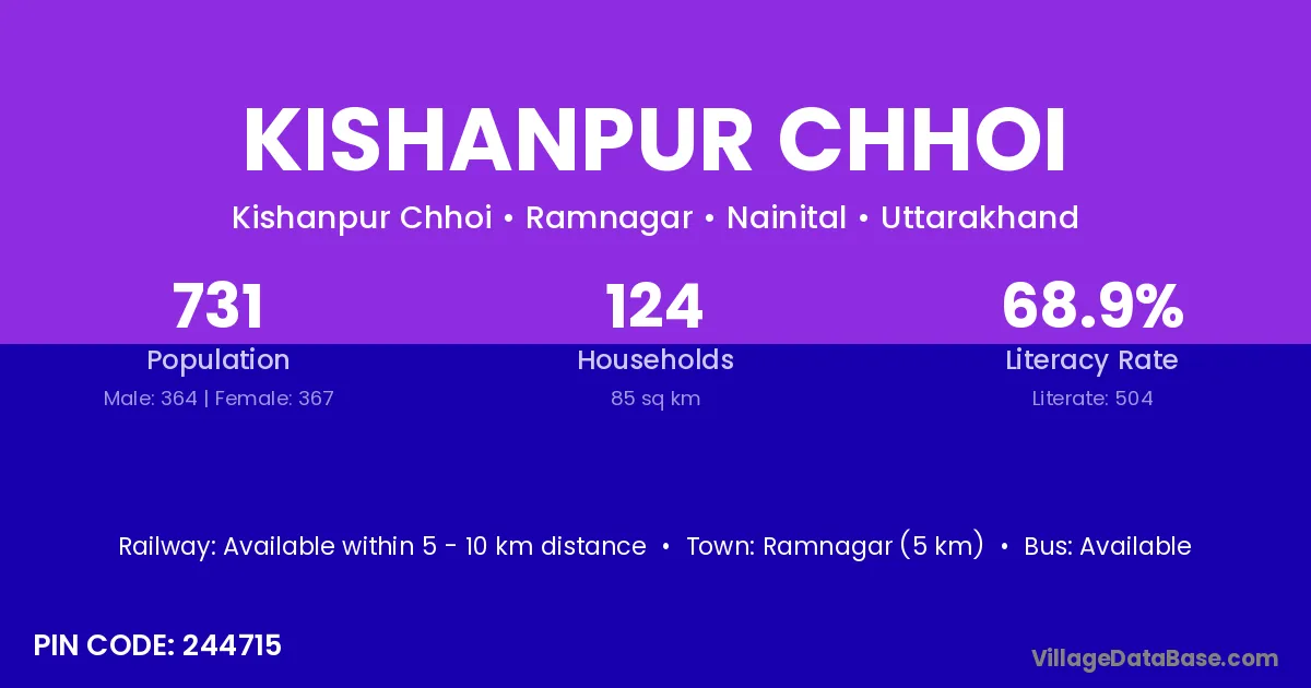 Ramnagar (5 km) is the nearest town to Kishanpur Chhoi village for major economic activities and is located approximately 5 km away.