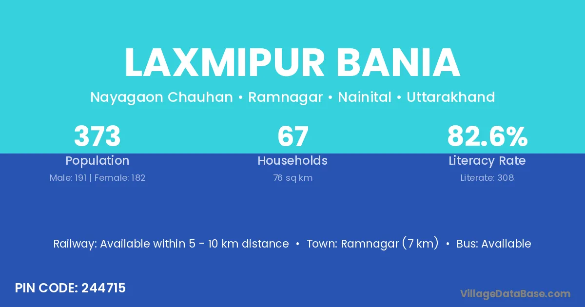 Ramnagar (7 km) is the nearest town to Laxmipur Bania village for major economic activities and is located approximately 7 km away.