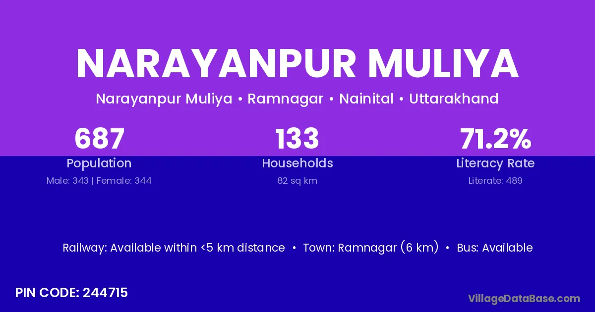 Ramnagar (6 km) is the nearest town to Narayanpur Muliya village for major economic activities and is located approximately 6 km away.