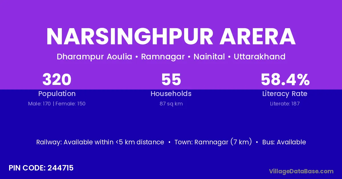 Ramnagar (7 km) is the nearest town to Narsinghpur Arera village for major economic activities and is located approximately 7 km away.
