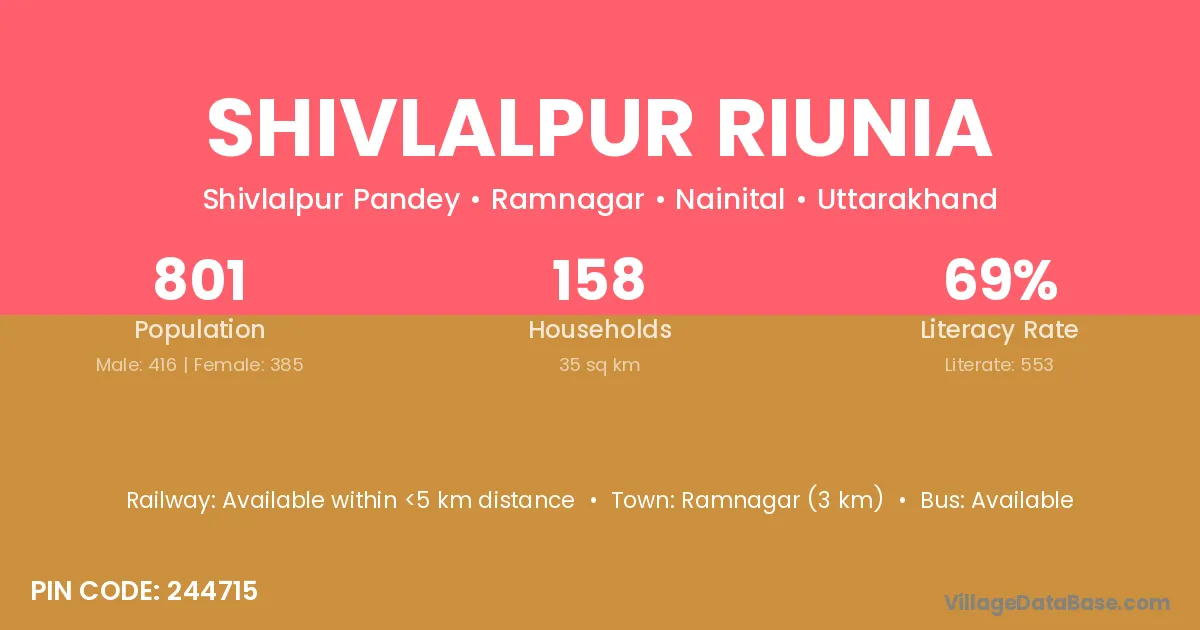 Ramnagar (3 km) is the nearest town to Shivlalpur Riunia village for major economic activities and is located approximately 3 km away.