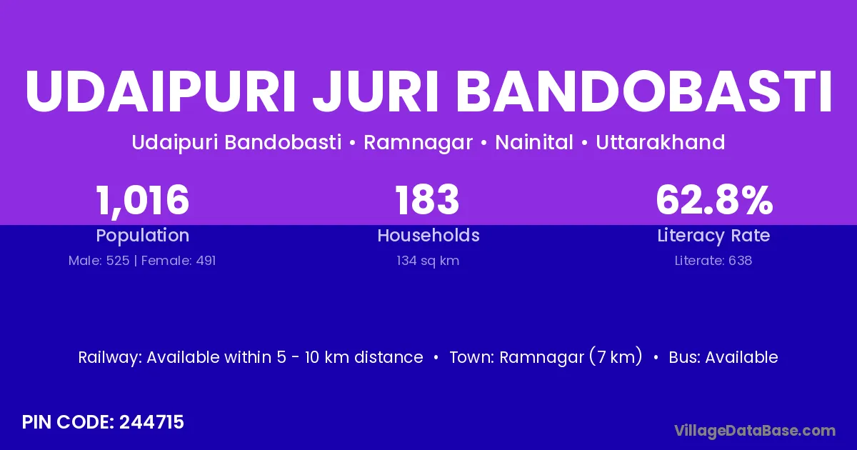 Ramnagar (7 km) is the nearest town to Udaipuri Juri Bandobasti village for major economic activities and is located approximately 7 km away.
