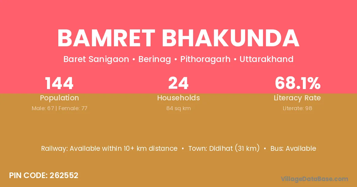 Didihat (31 km) is the nearest town to Bamret Bhakunda village for major economic activities and is located approximately 31 km away.
