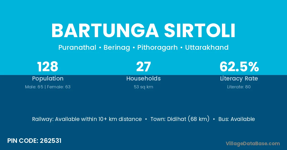 Didihat (68 km) is the nearest town to Bartunga Sirtoli village for major economic activities and is located approximately 68 km away.
