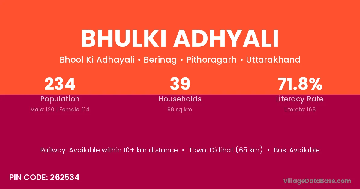 Didihat (65 km) is the nearest town to Bhulki Adhyali village for major economic activities and is located approximately 65 km away.