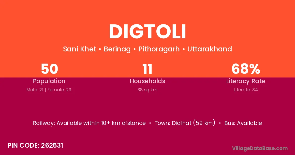 Didihat (59 km) is the nearest town to Digtoli village for major economic activities and is located approximately 59 km away.