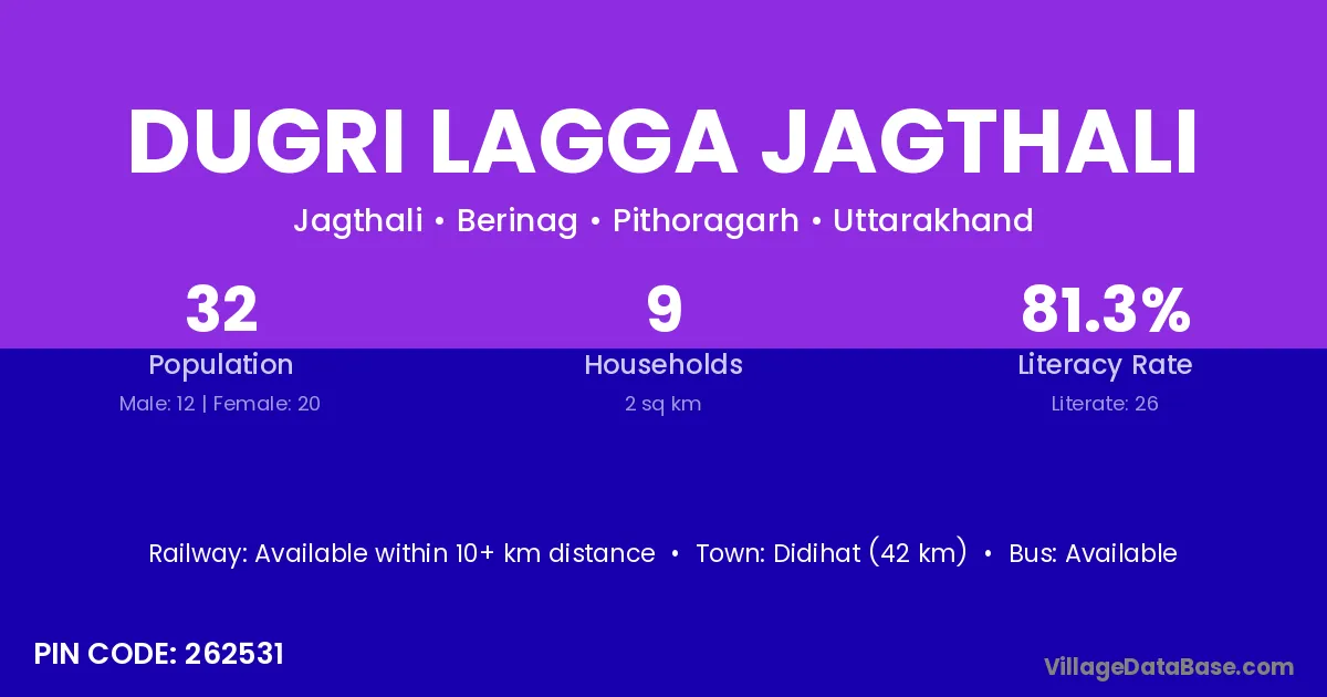 Didihat (42 km) is the nearest town to Dugri Lagga Jagthali village for major economic activities and is located approximately 42 km away.