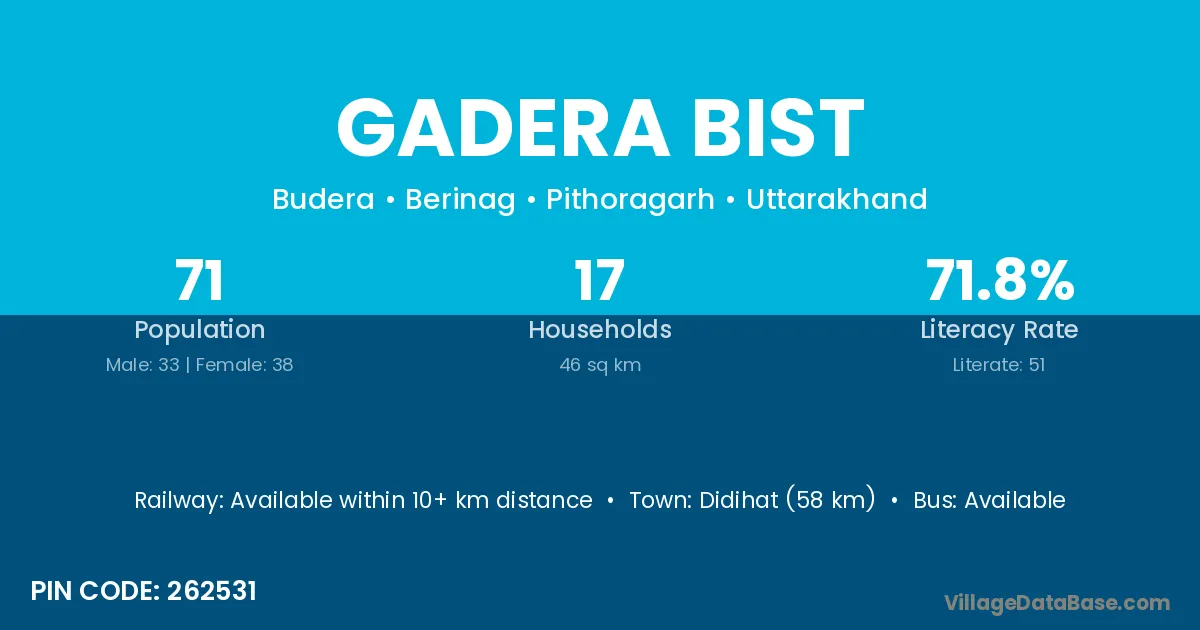 Didihat (58 km) is the nearest town to Gadera Bist village for major economic activities and is located approximately 58 km away.