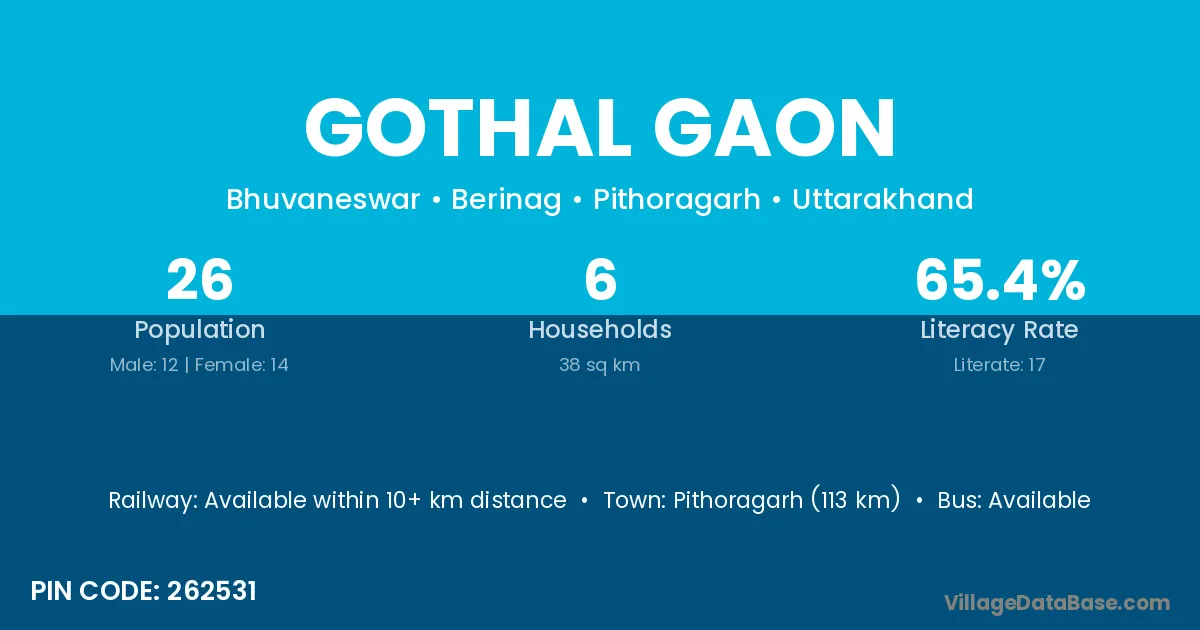 Pithoragarh (113 km) is the nearest town to Gothal Gaon village for major economic activities and is located approximately 113 km away.