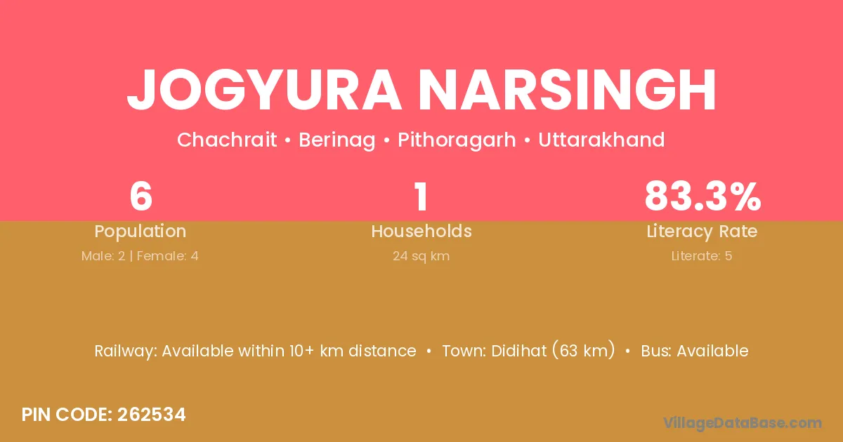 Didihat (63 km) is the nearest town to Jogyura Narsingh village for major economic activities and is located approximately 63 km away.