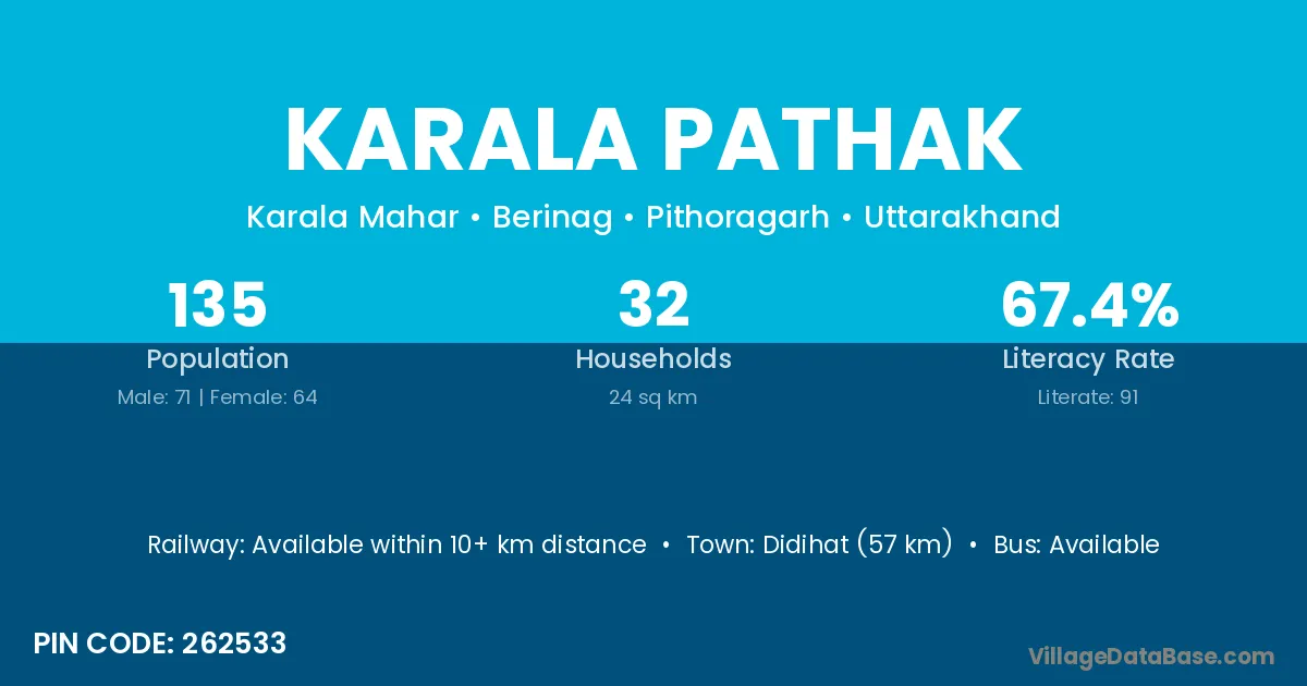 Didihat (57 km) is the nearest town to Karala Pathak village for major economic activities and is located approximately 57 km away.