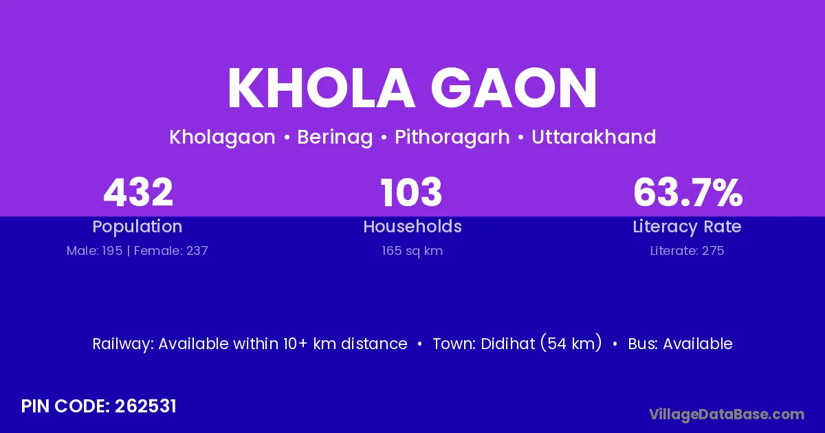 Didihat (54 km) is the nearest town to Khola Gaon village for major economic activities and is located approximately 54 km away.