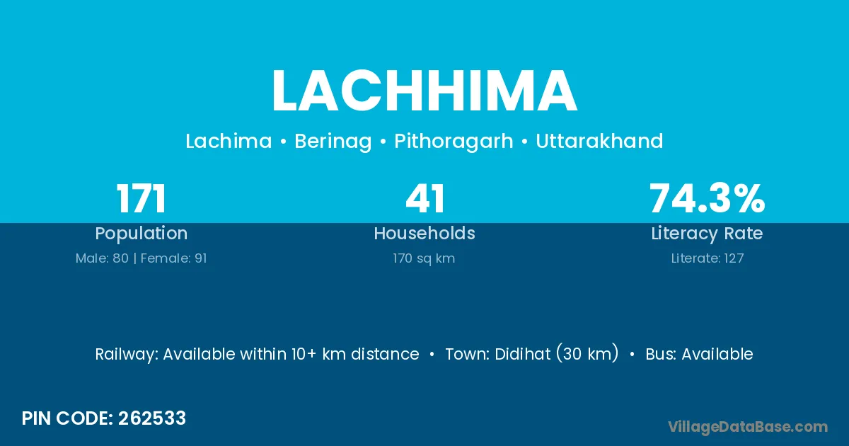 Didihat (30 km) is the nearest town to Lachhima village for major economic activities and is located approximately 30 km away.