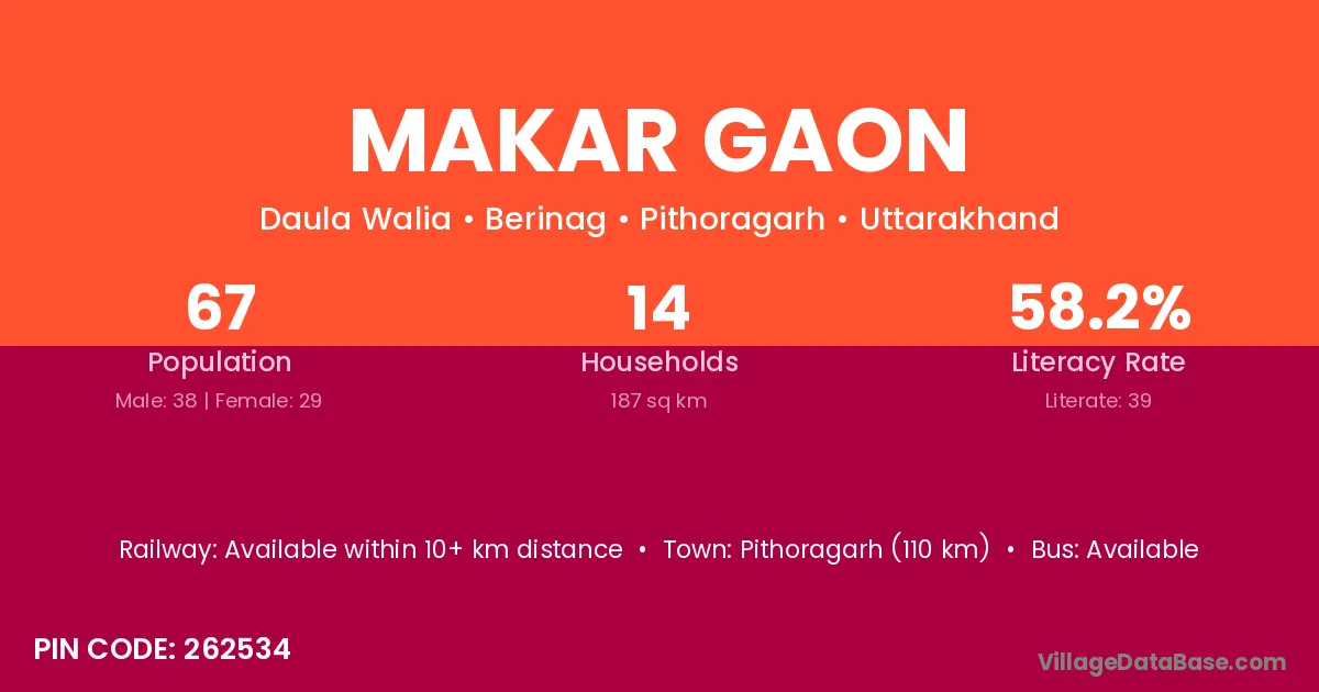 Pithoragarh (110 km) is the nearest town to Makar Gaon village for major economic activities and is located approximately 110 km away.