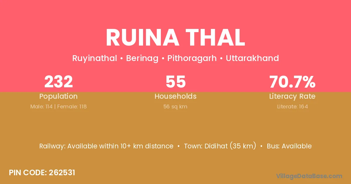 Didihat (35 km) is the nearest town to Ruina Thal village for major economic activities and is located approximately 35 km away.