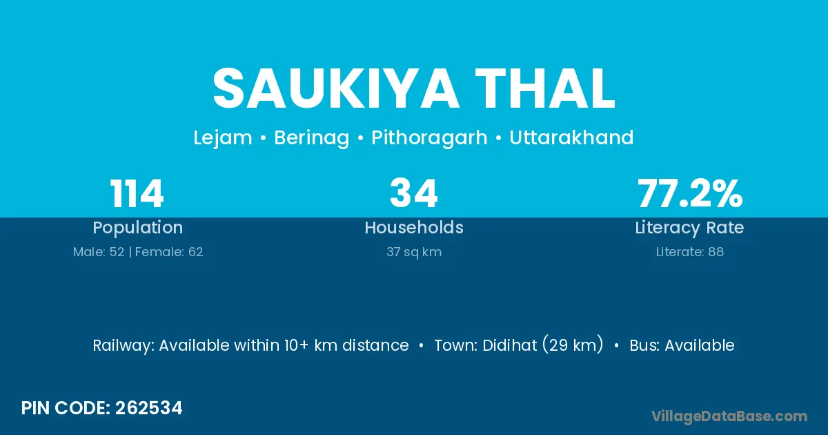 Didihat (29 km) is the nearest town to Saukiya Thal village for major economic activities and is located approximately 29 km away.