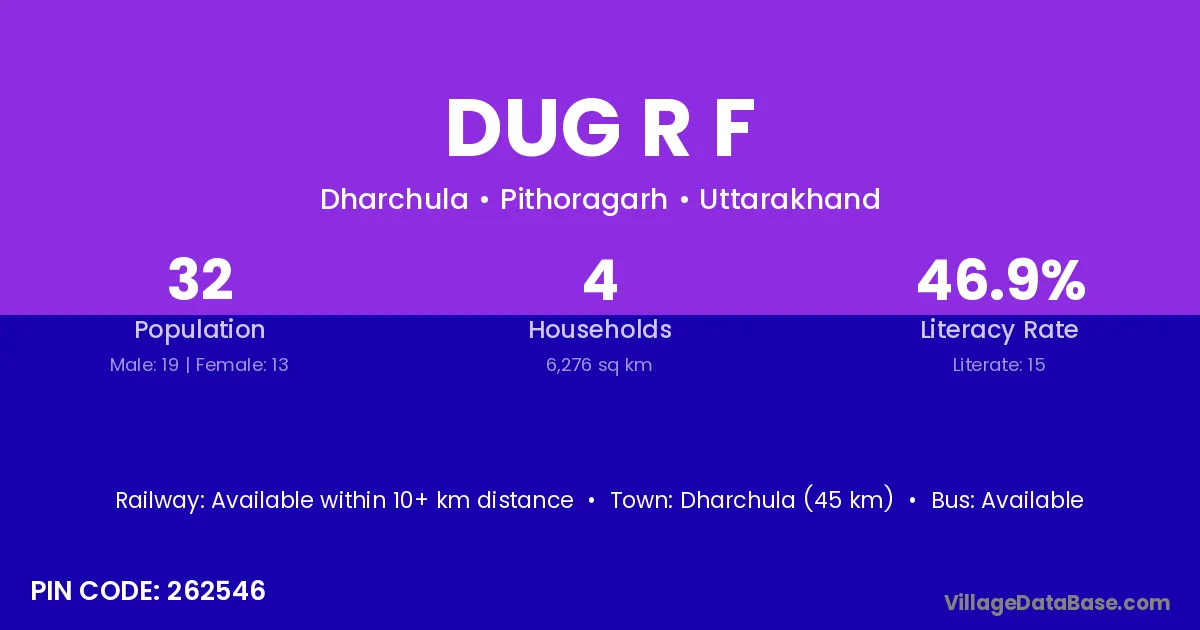 Dharchula (45 km) is the nearest town to Dug R F village for major economic activities and is located approximately 45 km away.