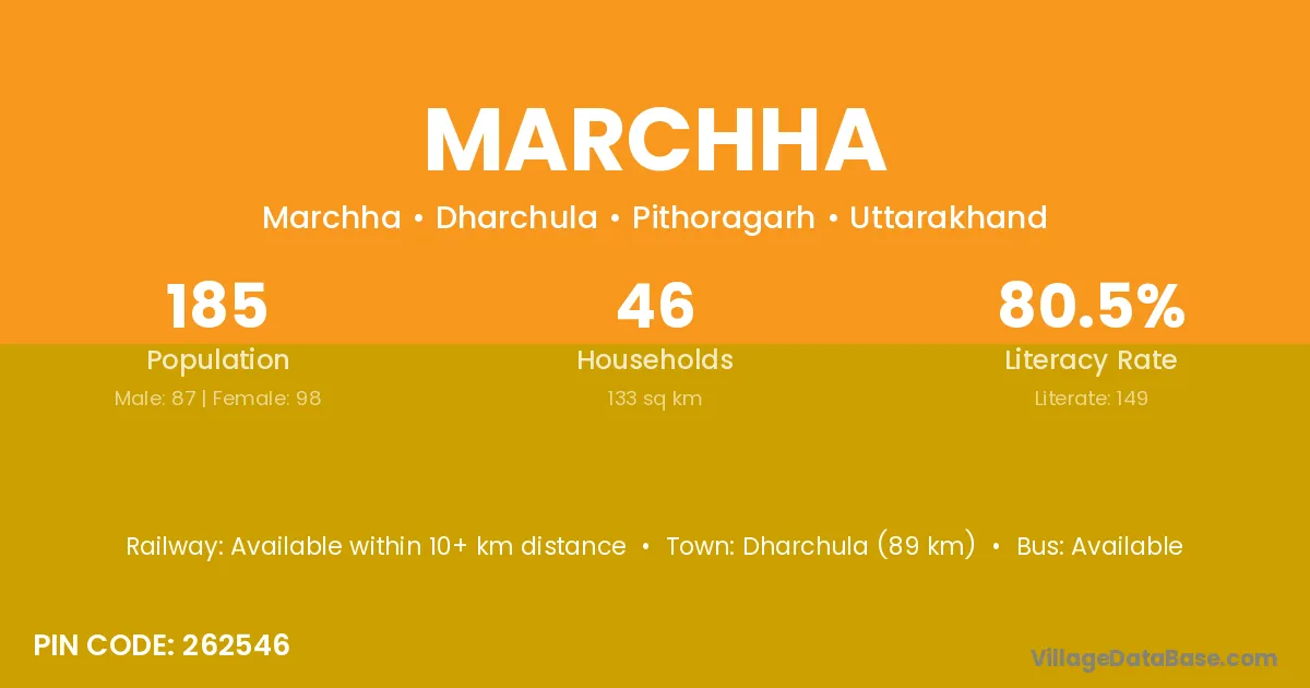 Dharchula (89 km) is the nearest town to Marchha village for major economic activities and is located approximately 89 km away.