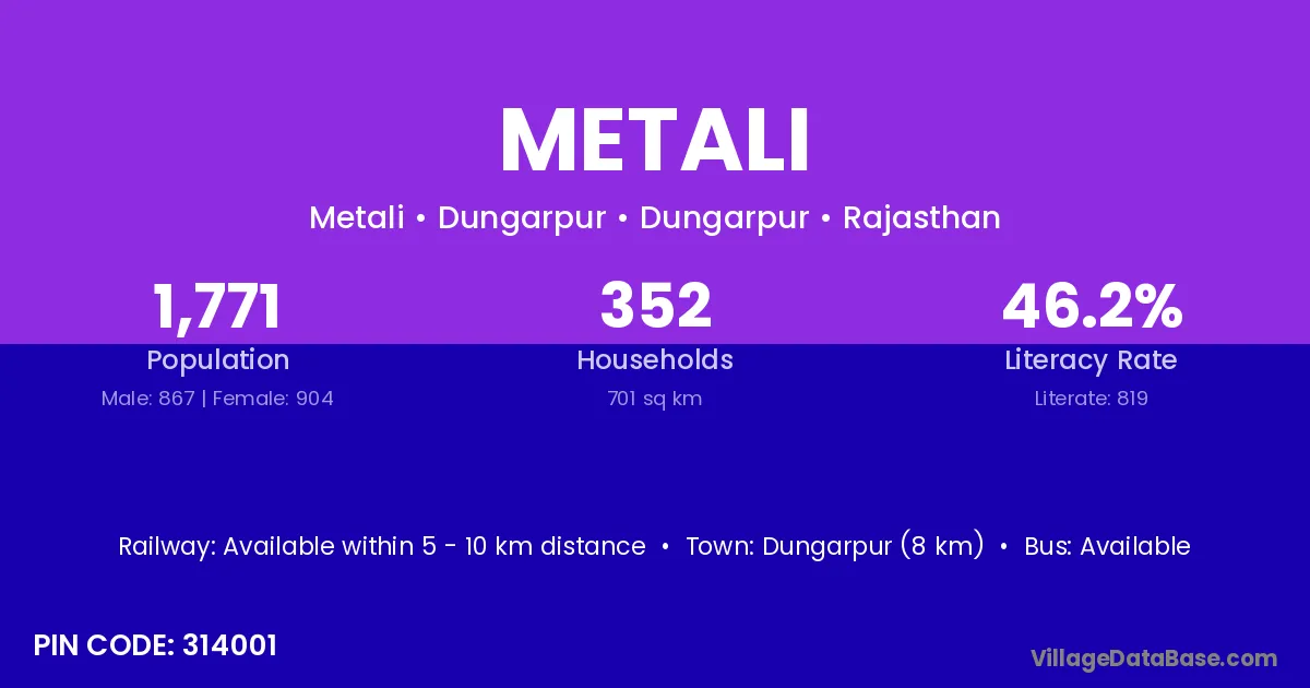 Metali village has a total population of 1,761 people, of which 849 are males and 912 are females.