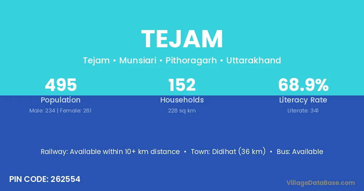 Dharchula (44 km) is the nearest town to Tejam village for major economic activities and is located approximately 44 km away.