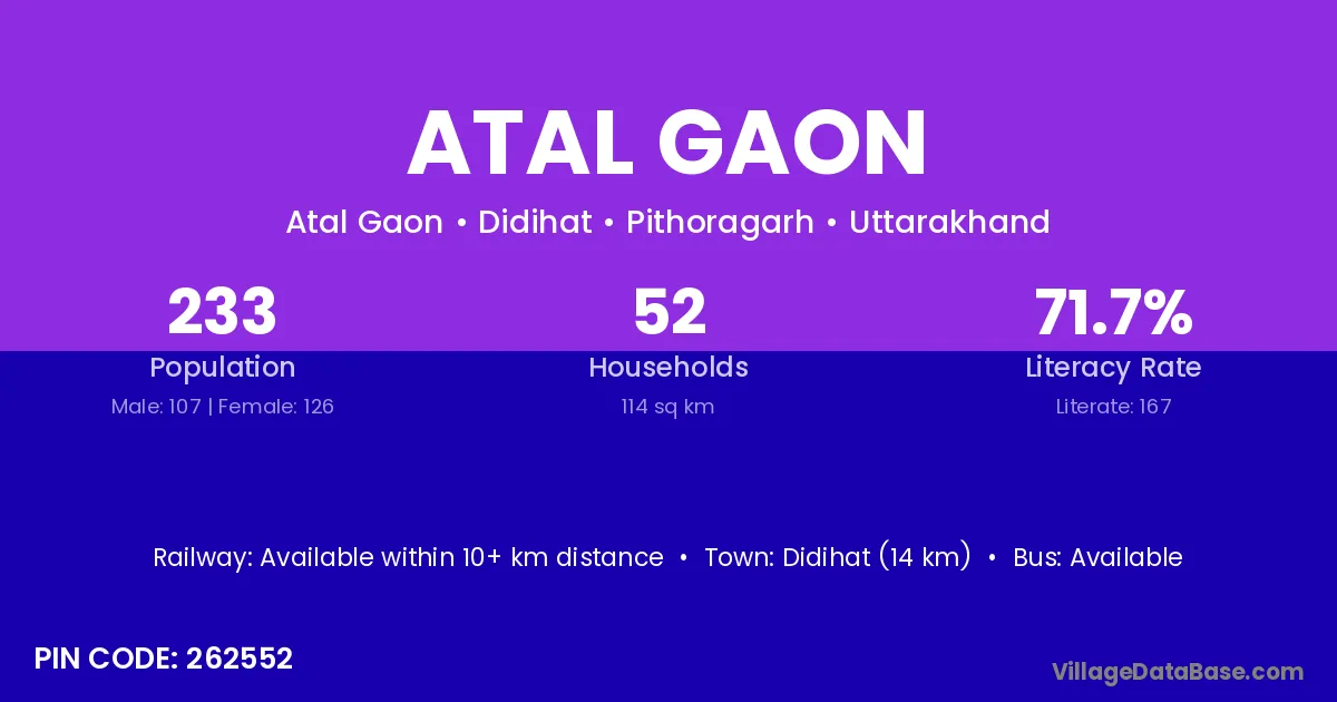 Didihat (14 km) is the nearest town to Atal Gaon village for major economic activities and is located approximately 14 km away.