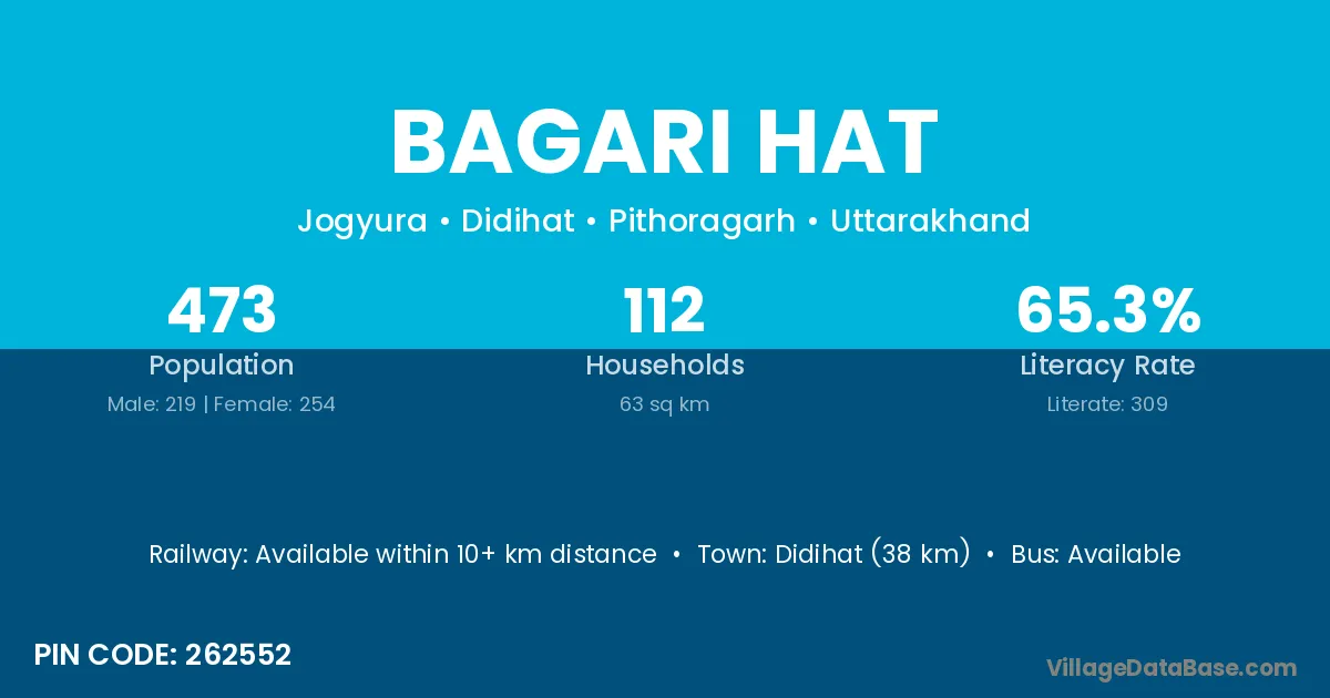 Didihat (38 km) is the nearest town to Bagari Hat village for major economic activities and is located approximately 38 km away.