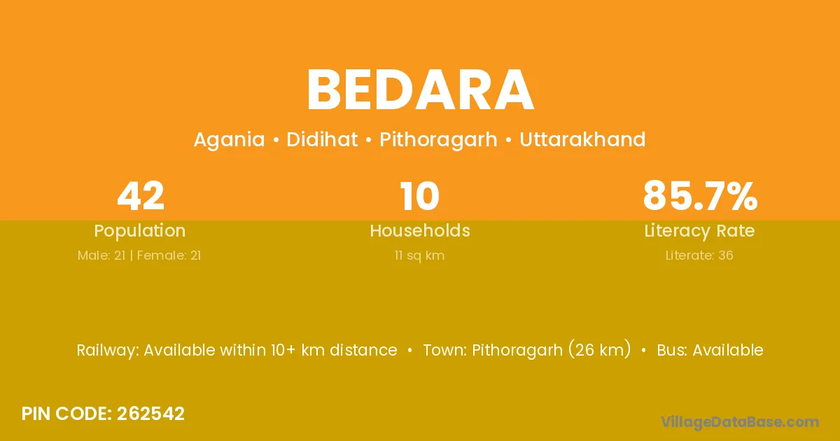 Pithoragarh (26 km) is the nearest town to Bedara village for major economic activities and is located approximately 26 km away.