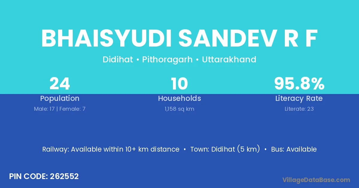 Bhaisyudi Sandev R F village is located in the Didihat Tehsil of the Pithoragarh district in Uttarakhand .