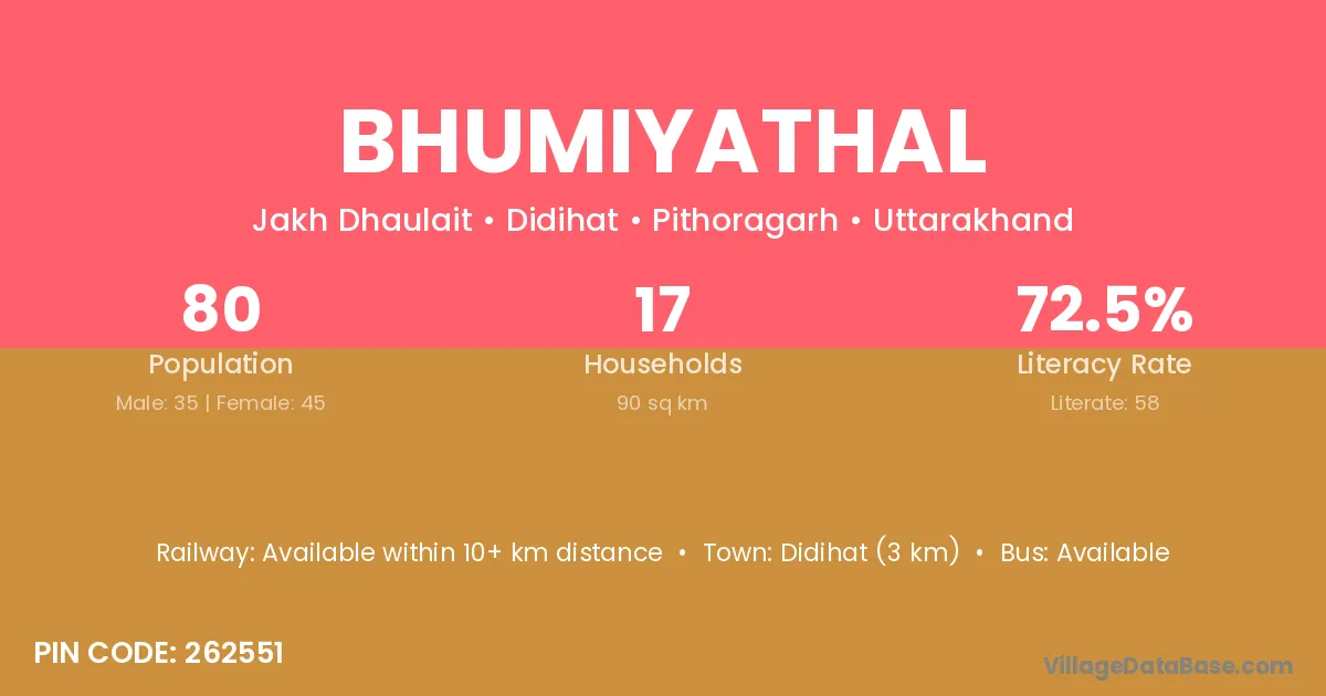 Didihat (3 km) is the nearest town to Bhumiyathal village for major economic activities and is located approximately 3 km away.