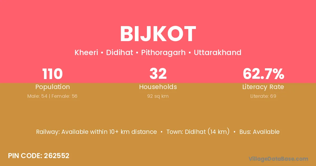 Didihat (14 km) is the nearest town to Bijkot village for major economic activities and is located approximately 14 km away.