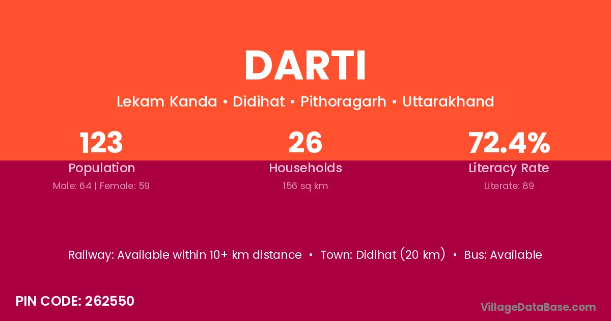 Didihat (20 km) is the nearest town to Darti village for major economic activities and is located approximately 20 km away.
