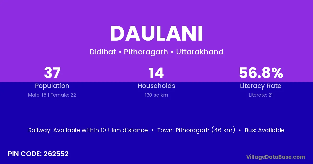 Pithoragarh (46 km) is the nearest town to Daulani village for major economic activities and is located approximately 46 km away.