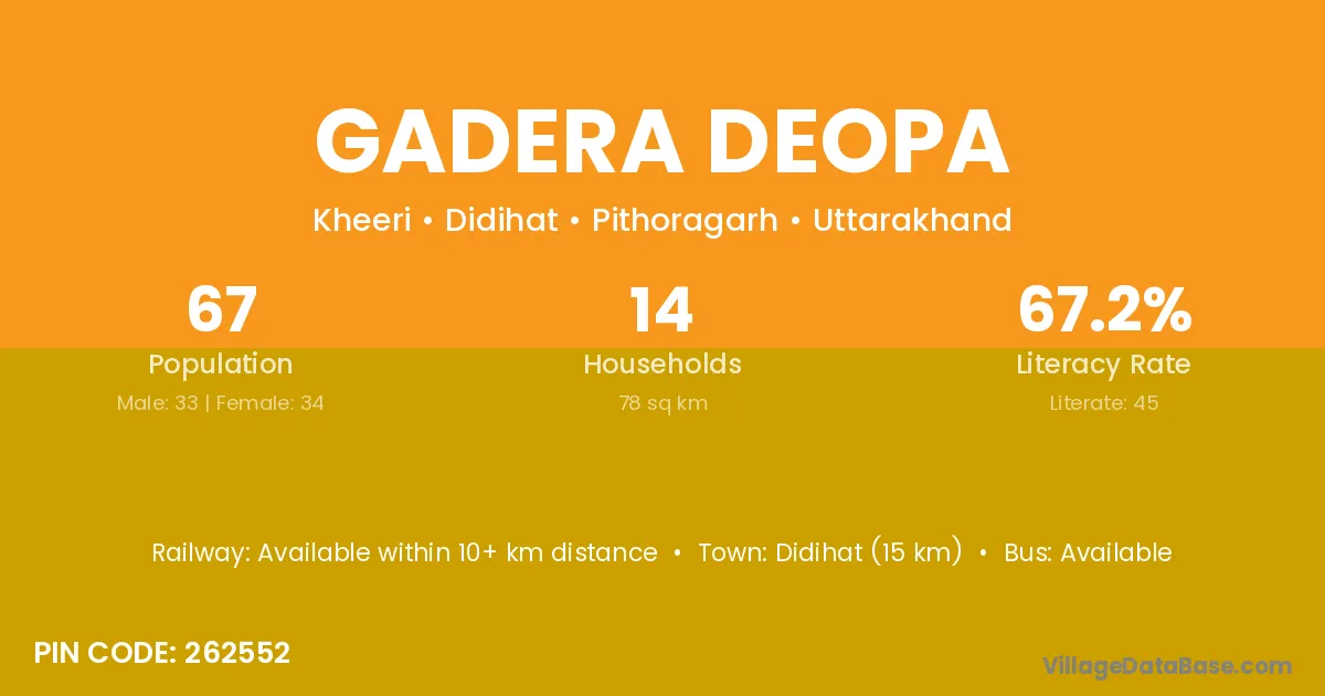 Didihat (15 km) is the nearest town to Gadera Deopa village for major economic activities and is located approximately 15 km away.