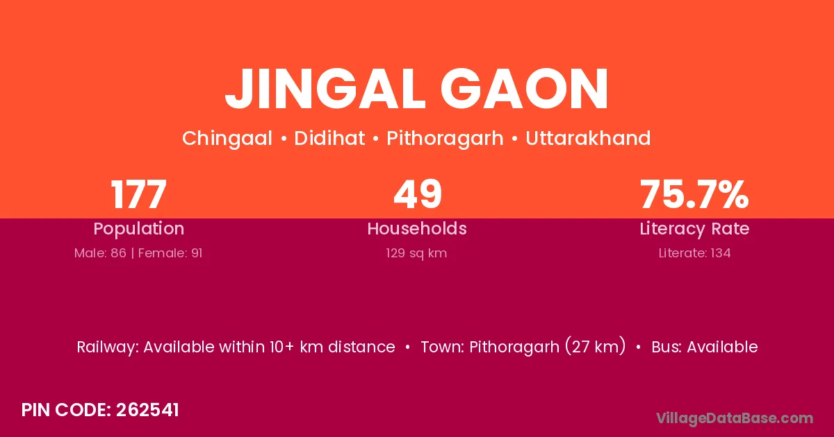 Pithoragarh (27 km) is the nearest town to Jingal Gaon village for major economic activities and is located approximately 27 km away.