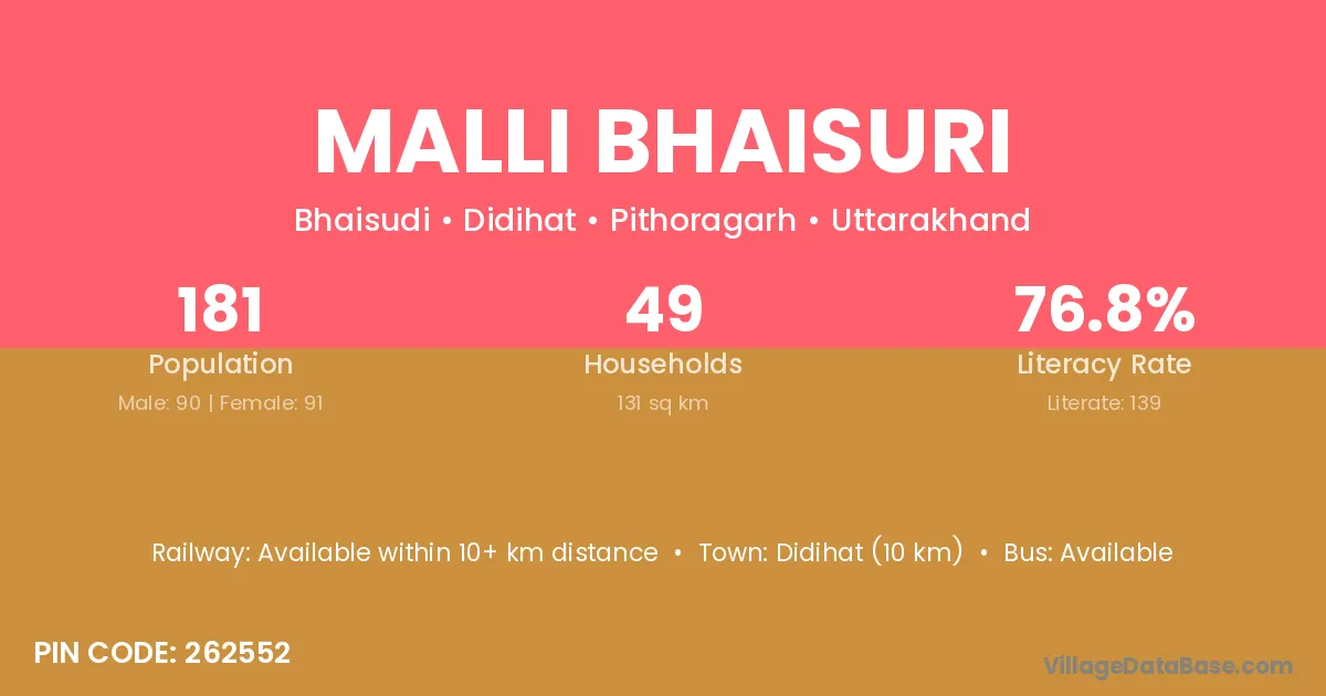 Didihat (10 km) is the nearest town to Malli Bhaisuri village for major economic activities and is located approximately 10 km away.