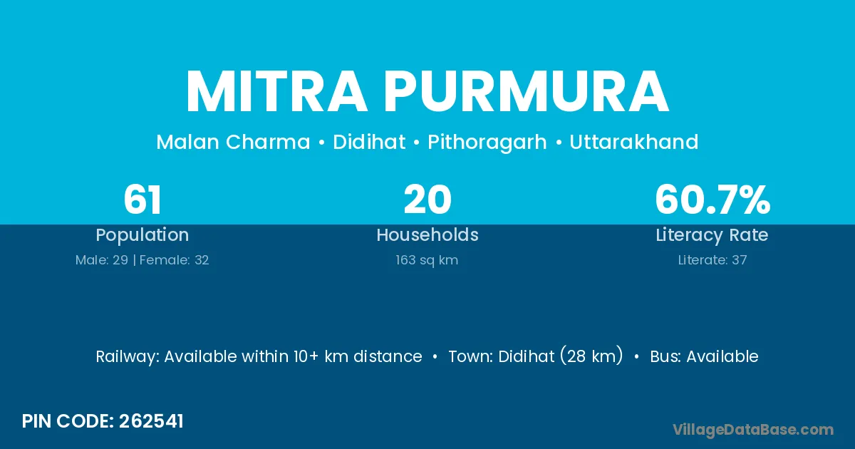 Didihat (28 km) is the nearest town to Mitra Purmura village for major economic activities and is located approximately 28 km away.