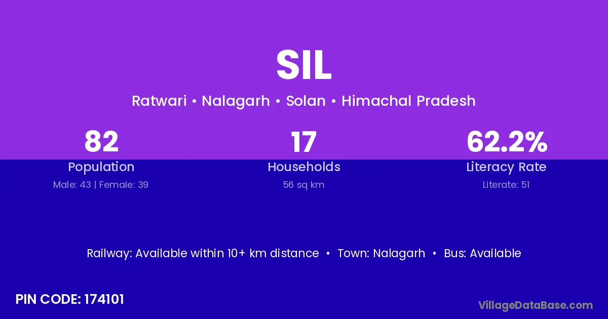 The literacy rate of Sil village is 73.88%. Male literacy stands at 81.25% and female literacy at 67.14%.