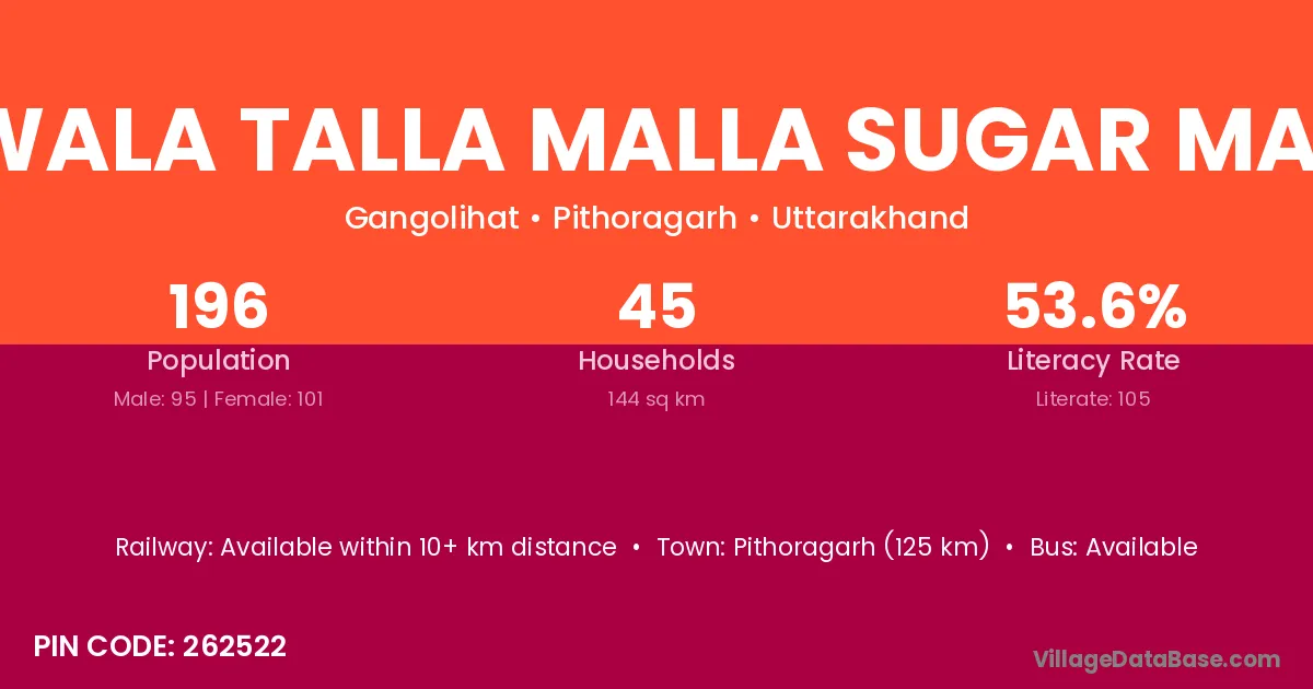 Pithoragarh (125 km) is the nearest town to Anwala Talla Malla Sugar Mavla village for major economic activities and is located approximately 125 km away.