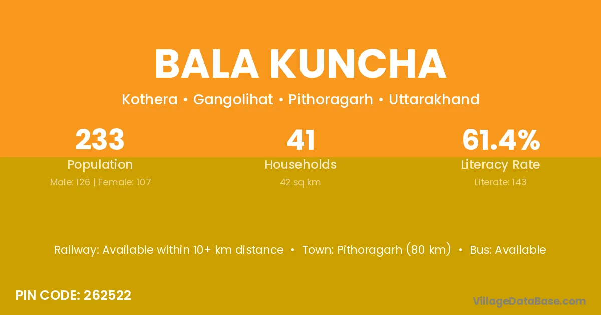 Pithoragarh (80 km) is the nearest town to Bala Kuncha village for major economic activities and is located approximately 80 km away.