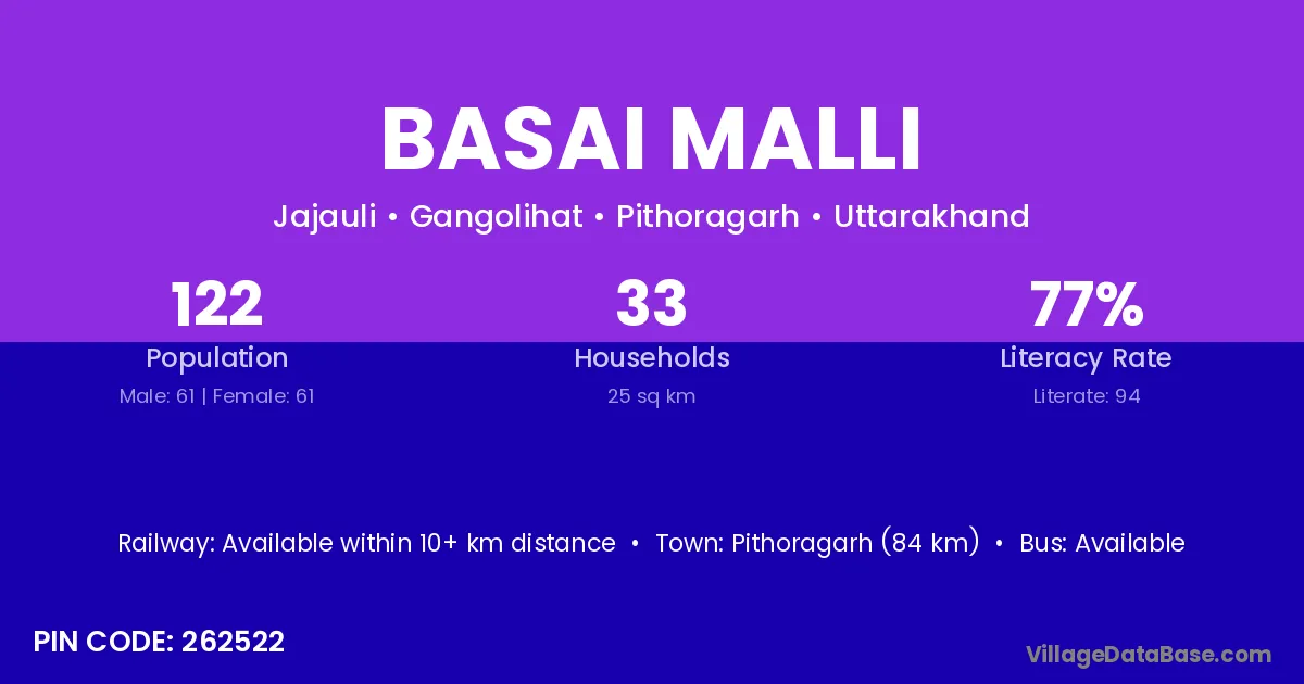 Pithoragarh (84 km) is the nearest town to Basai Malli village for major economic activities and is located approximately 84 km away.